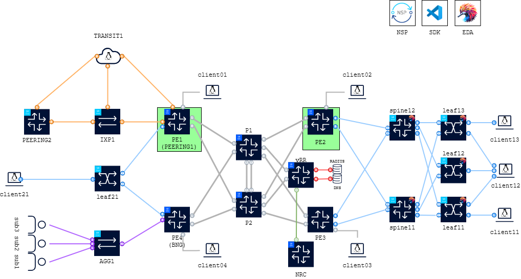 For this activity we will focus on a subset of the main topology considering only the SROS PEs, the P routers and clients. The PE1 and PE2 nodes are FP5-based and will be configured with ANYsec and IP/MPLS services to provide quantum-safe transport between client01 and client02, as illustrated in Fig. 2. below: