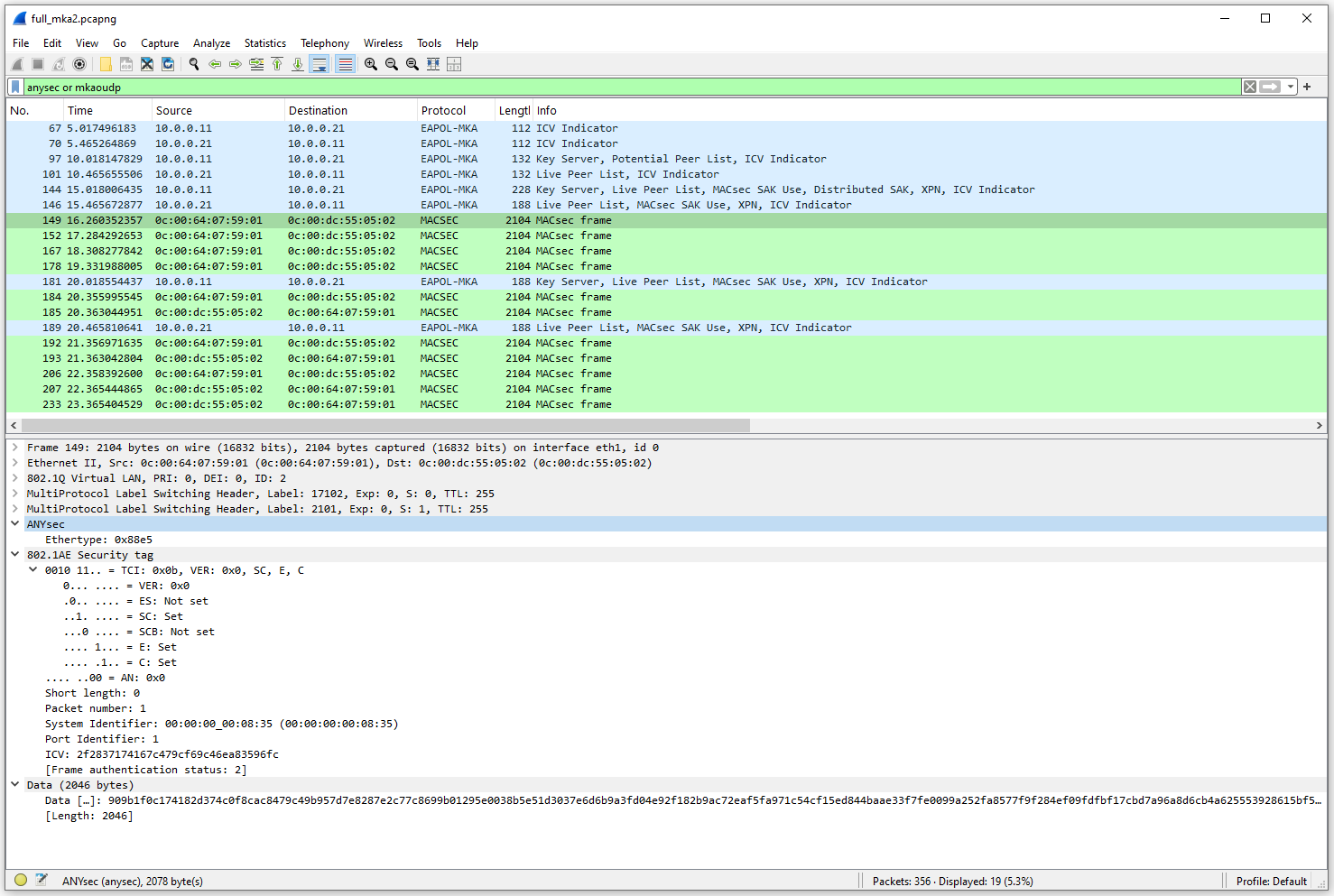 2. Configure the client hosts, test the connectivity and use Wireshark, Edgeshark or TCPDump to observe the ANYsec packet headers.