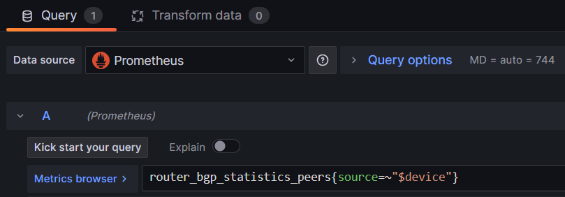 In this task you will create a variable that allows users to select which device (source) they want to view metrics for, directly from a drop-down menu.