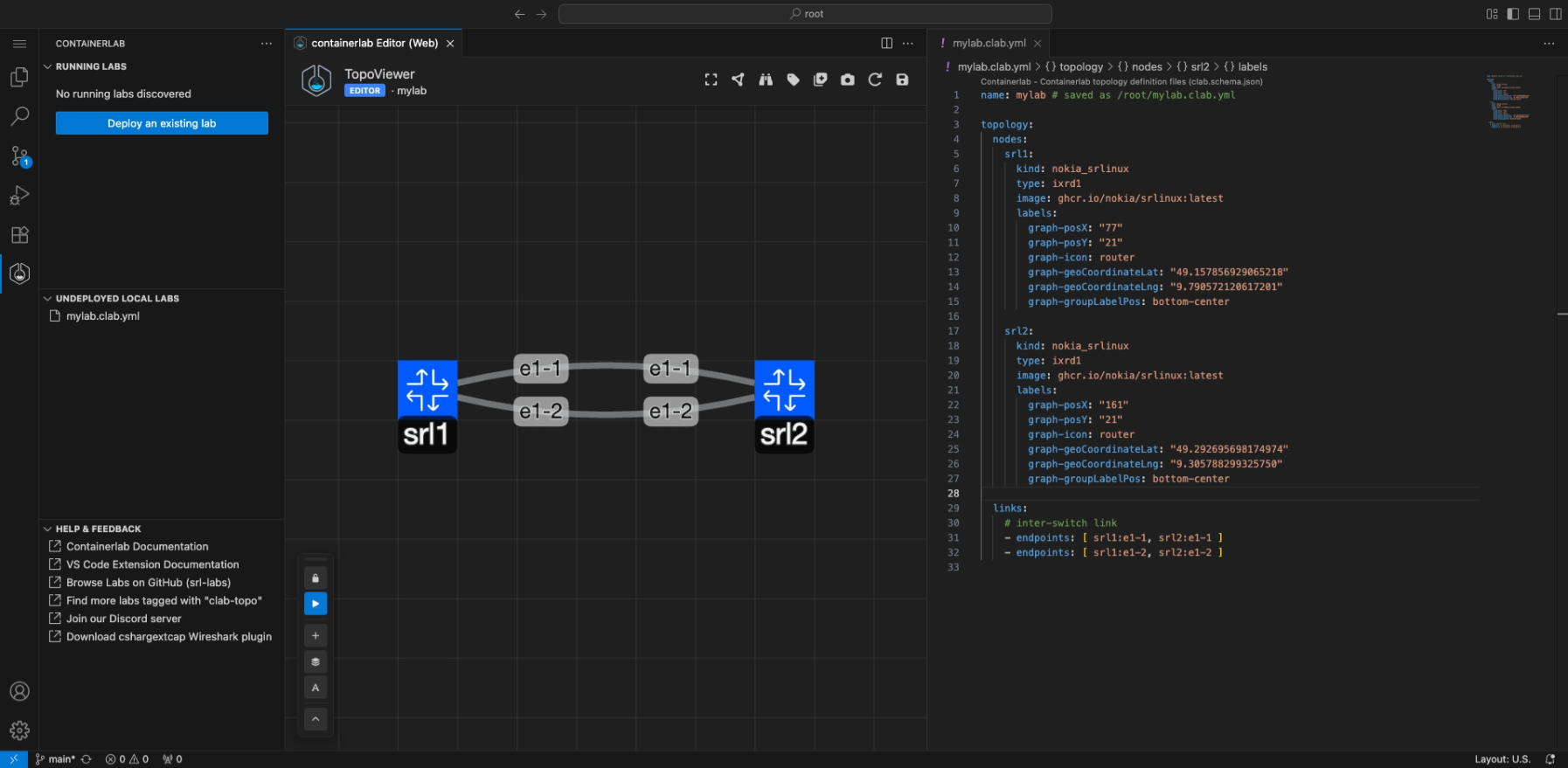 The VS Code Containerlab Extension enhances the Containerlab user experience. Taking advantage of powerful text editing functionality and the extensibility of Visual Studio Code, the extension provides an easy way to manage the entire lifecycle of your labs.